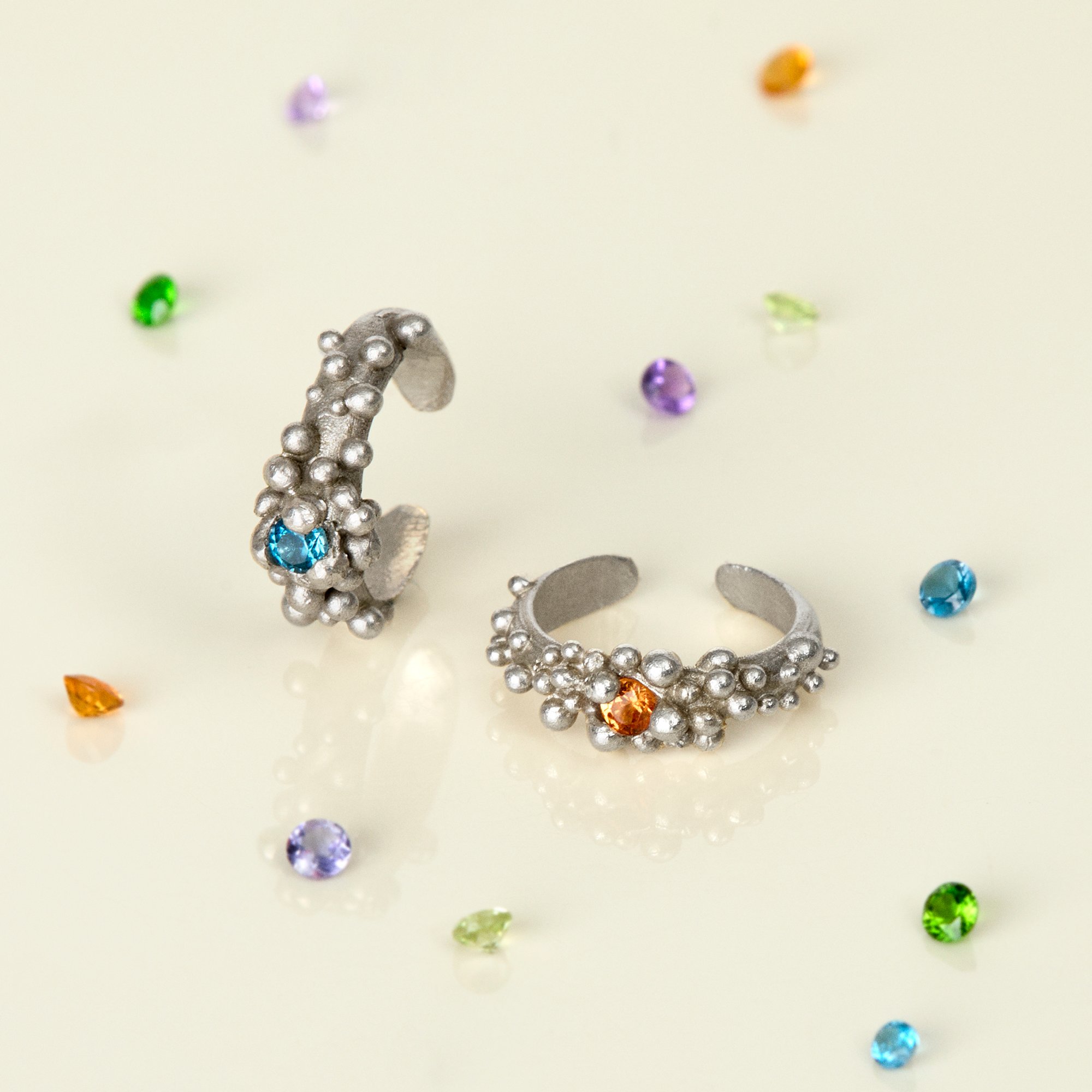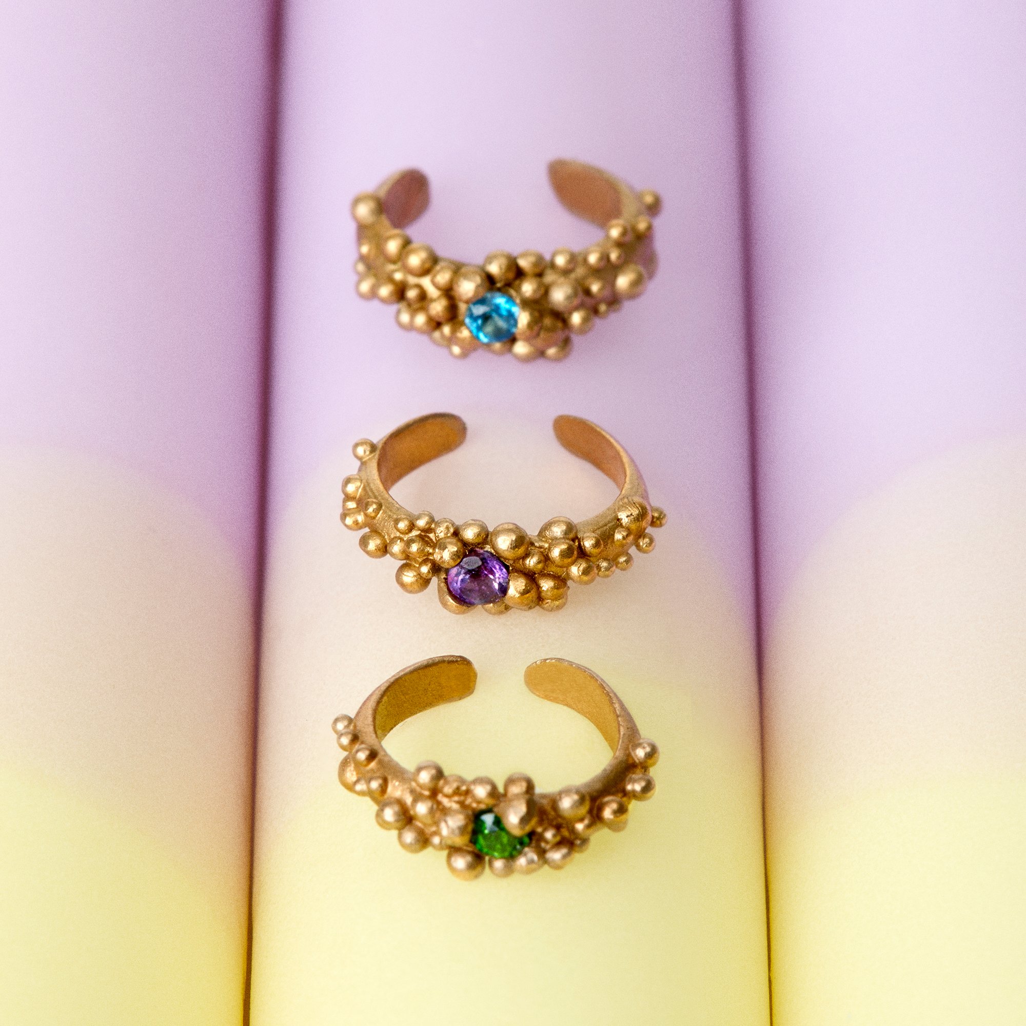 Le pietre a disposizione sono il quarzo citrino, l’ametista, la iolite, il peridoto e il topazio blu London. L'incastonatura è stata realizzata con precisione per integrare la pietra perfettamente nel design dell'anello, creando un contrasto affascinante tra la lucentezza della gemma e l'elemento etereo delle bolle circostanti.