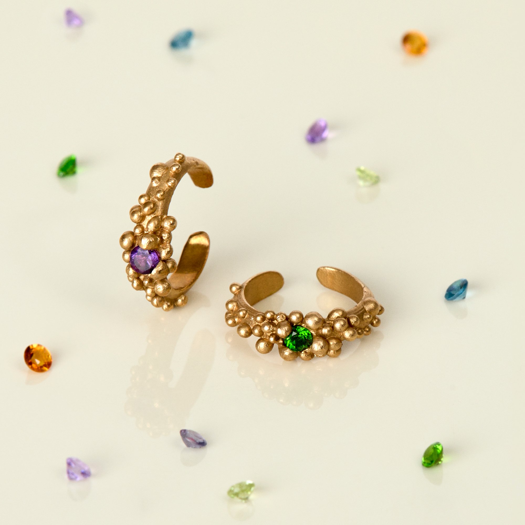L'ear cuff Bule, si distingue per la sua delicata decorazione a bolle, lavorate una ad una a mano con la tecnica della cera persa. Le diverse dimensioni e la loro disposizione irregolare creano un effetto leggero e dinamico, dando al pezzo un’aura eterea e un po’ magica.