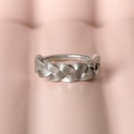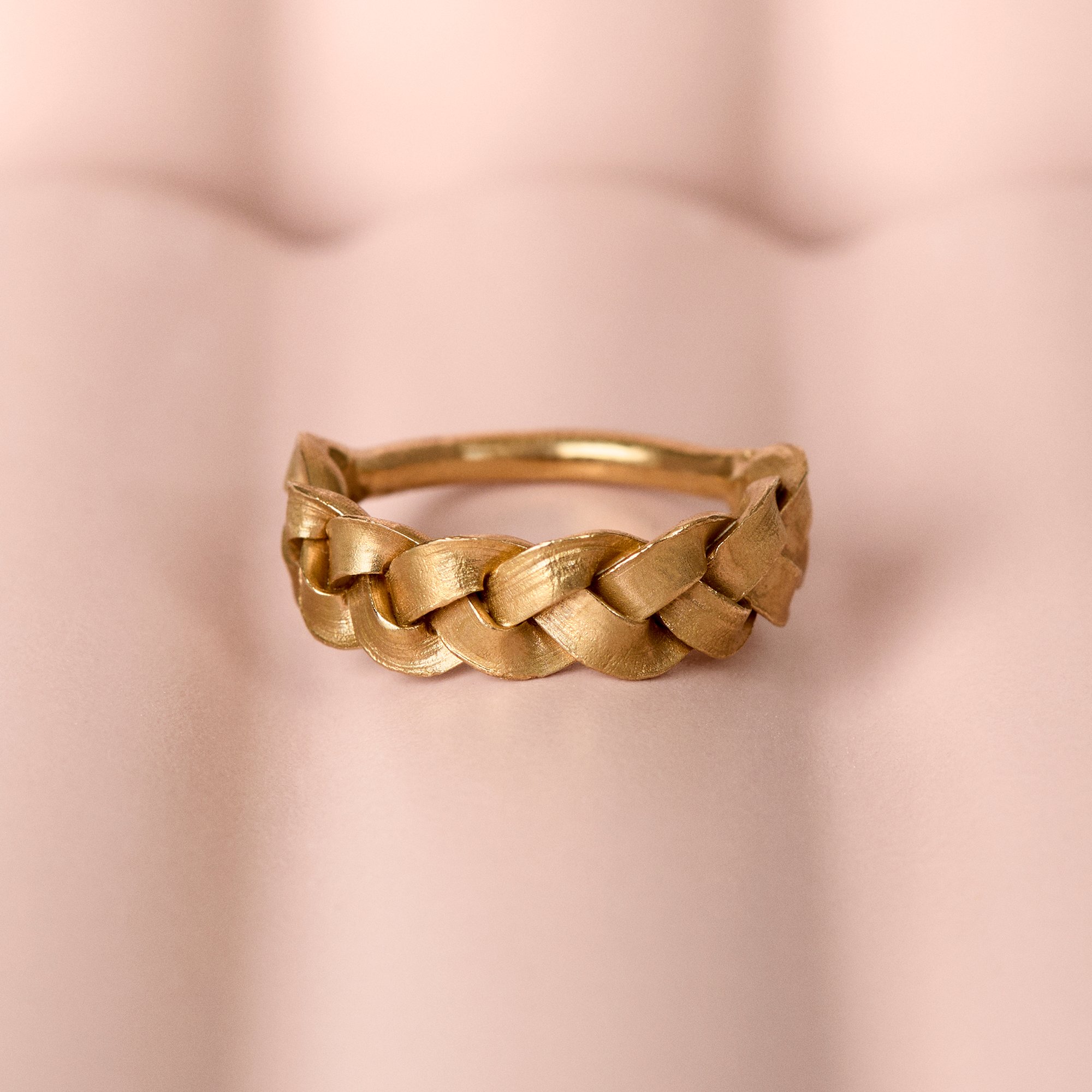 Questo anello è caratterizzato da un raffinato intreccio che ricorda una treccia modellata a mano. Le fasce si avvolgono tra loro in modo morbido e armonioso, creando un design organico che unisce forza e delicatezza.
